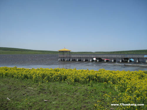 月亮湖位于林海与草原的结合部,东、北两面蓊蓊郁郁的松林,英姿飒爽,育青滴翠,浓荫蔽日,秋日蘑菇丛生,,徜徉其间,心旷神怡。西、南两面是平坦舒缓的草坡,由于距御道口牧点不远,故常常可见马群、牛群、羊群散落其间,自由觅食,山风徐来,绿浪翻滚,构成了一幅风吹草低见牛羊的美丽图画。在林海草原之间,月亮湖恰恰超到了一种“画龙点睛”的作用。从远处望去,经仿佛是一块镶嵌在王冠上的宝石,闪闪发光;又好像是少女的明眸,纯净清澈。到近处观看,它时而波平如镜,倒映着蓝天白云,里面波光粼粼,反射着点点阳光。假如你有兴趣,坐上汽艇到湖上兜风的话,那么你便可以领略到“沙鸥翔集,锦鳞游泳;岸芪汀兰,郁郁青青”的美丽景色。
